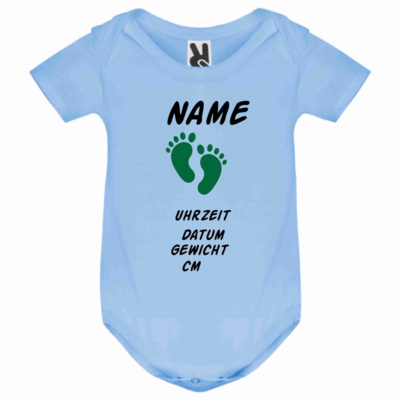 Babystrampler blau-schwarz-grün Name, Gewicht, Größe, Uhrzeit,