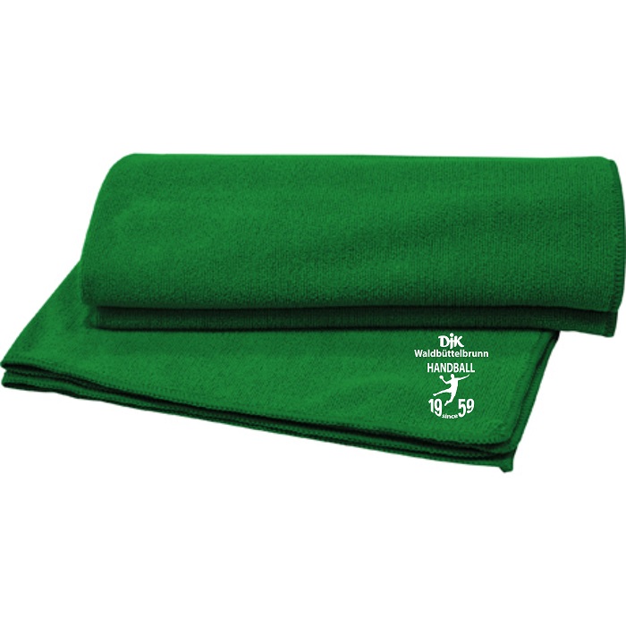Bade- und Sporthandtuch, mit Polyesterfilament zu drei Garnen im gleichen Farbton umwickelt, außer in der Farbe dunkles Blei (46), wo die Rippen in Fluor-Gelb (221) sind. Gummizug zum einfachen Falten.