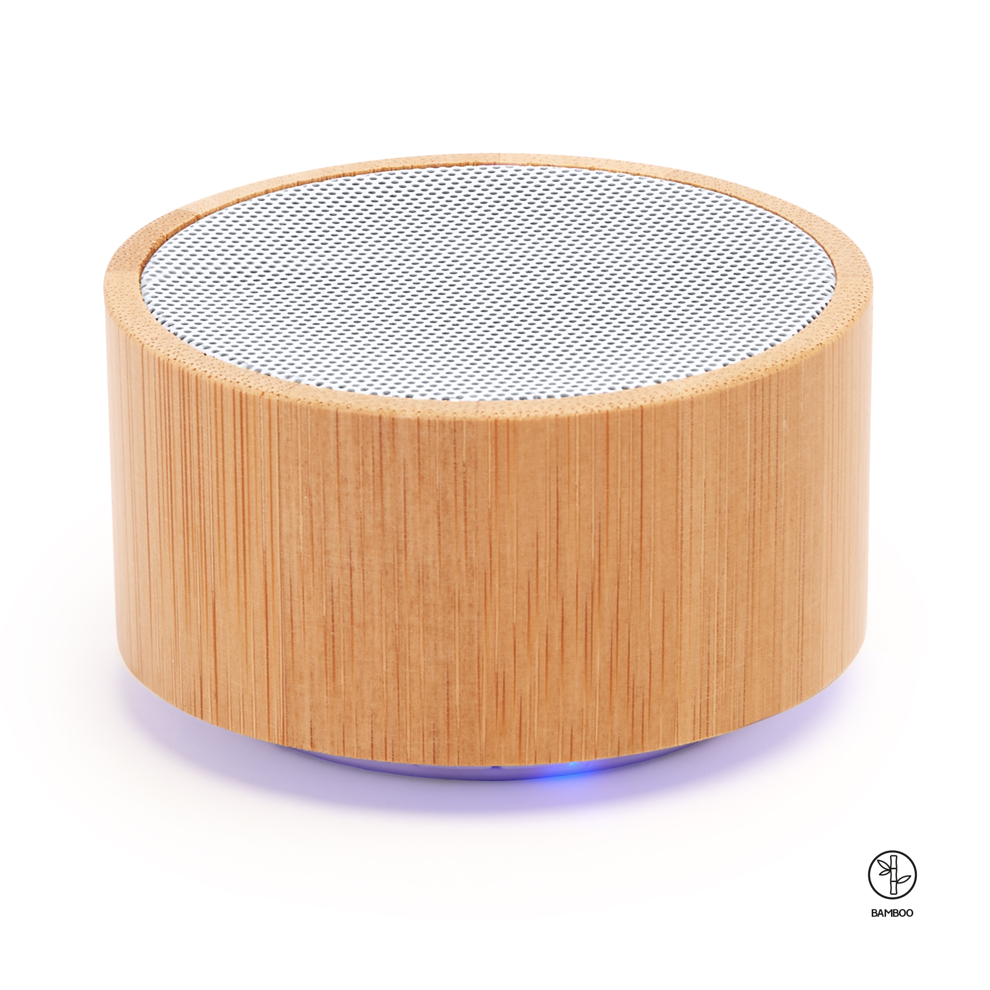 Runder drahtloser Lautsprecher mit weißem ABS-Gehäuse und natürlichem Bambus. Weiße Knöpfe und Gitter. FM-Radiofunktion, Freisprechfunktion, Mini-SD-Karteneinschub und 3W Leistung. Wiederaufladbare Batterie. Inklusive Kabel. Rutschfester Untergrund.