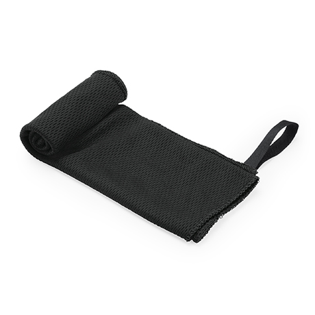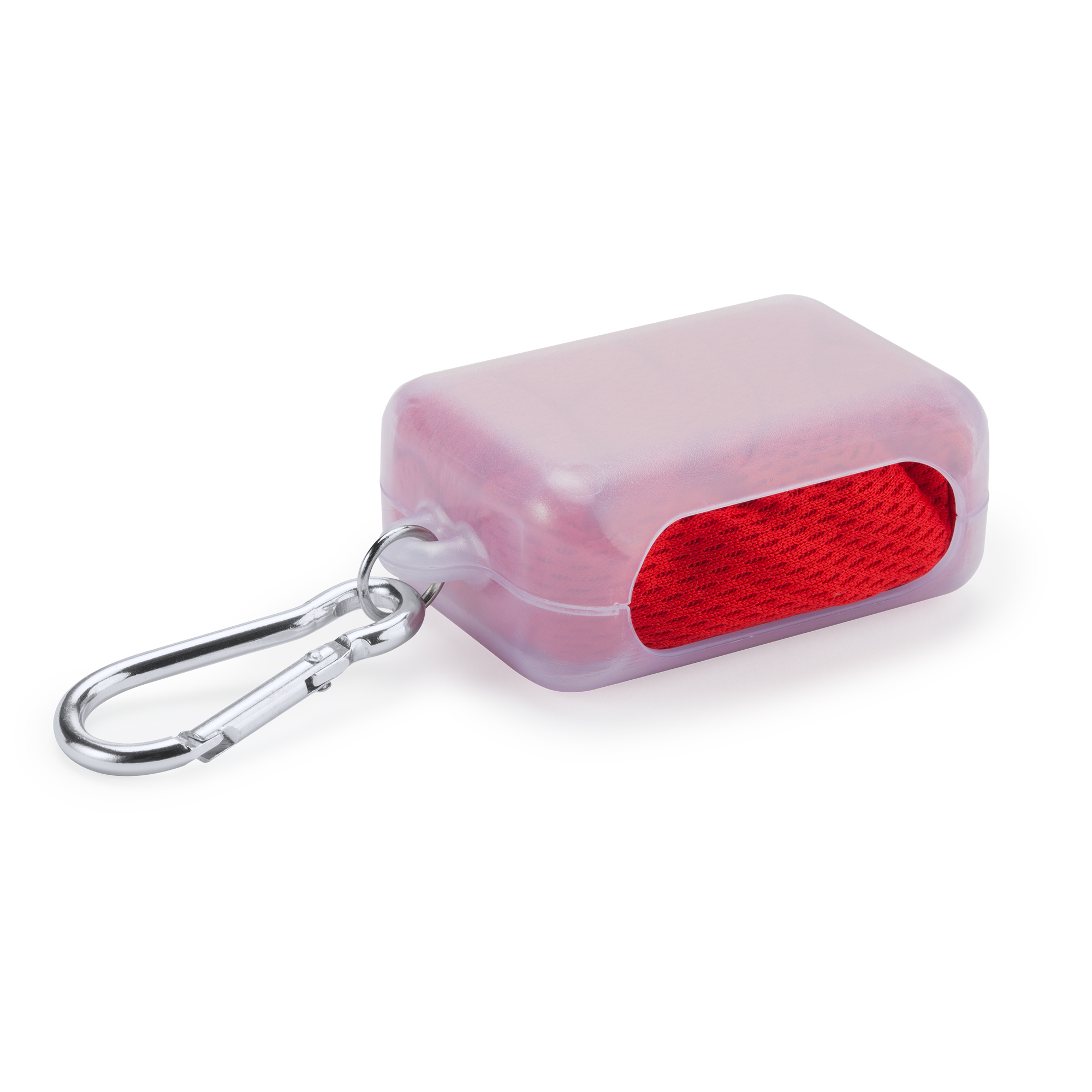 Mikrofaserhandtuch erfrischend. Präsentiert in einem praktischen Behälter mit Karabinerhaken
