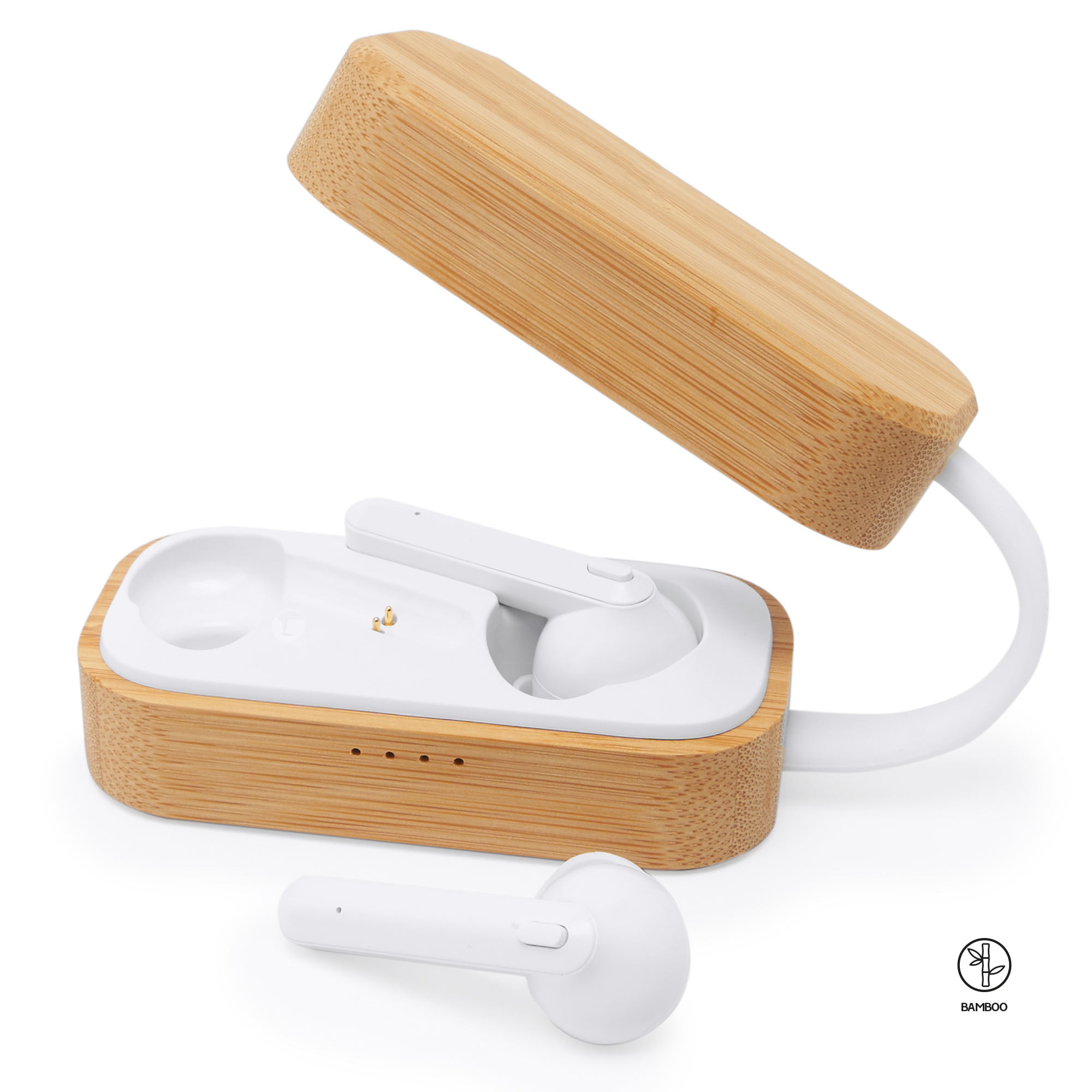 Wireless 5.0 Bluetooth-Ohrstöpsel mit Ladekoffer aus natürlichem Bambus. Eingebaute Multifunktionstaste an beiden Kopfhörern. Freisprechfunktion. Wiederaufladbare Batterie. Kabel enthalten. Verpackung eiinzeln in der Eco Design Box.